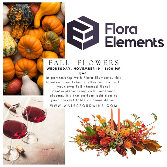 Join us for Wine & Design, a cozy and creative evening of autumn-inspired florals and wine at Waterford Wine & Spirits. In partnership with Flora Elements, this hands-on workshop invites you to craft your own fall-themed floral centerpiece using rich, seasonal blooms and natural textures. It's the perfect addition to your harvest table or home décor.